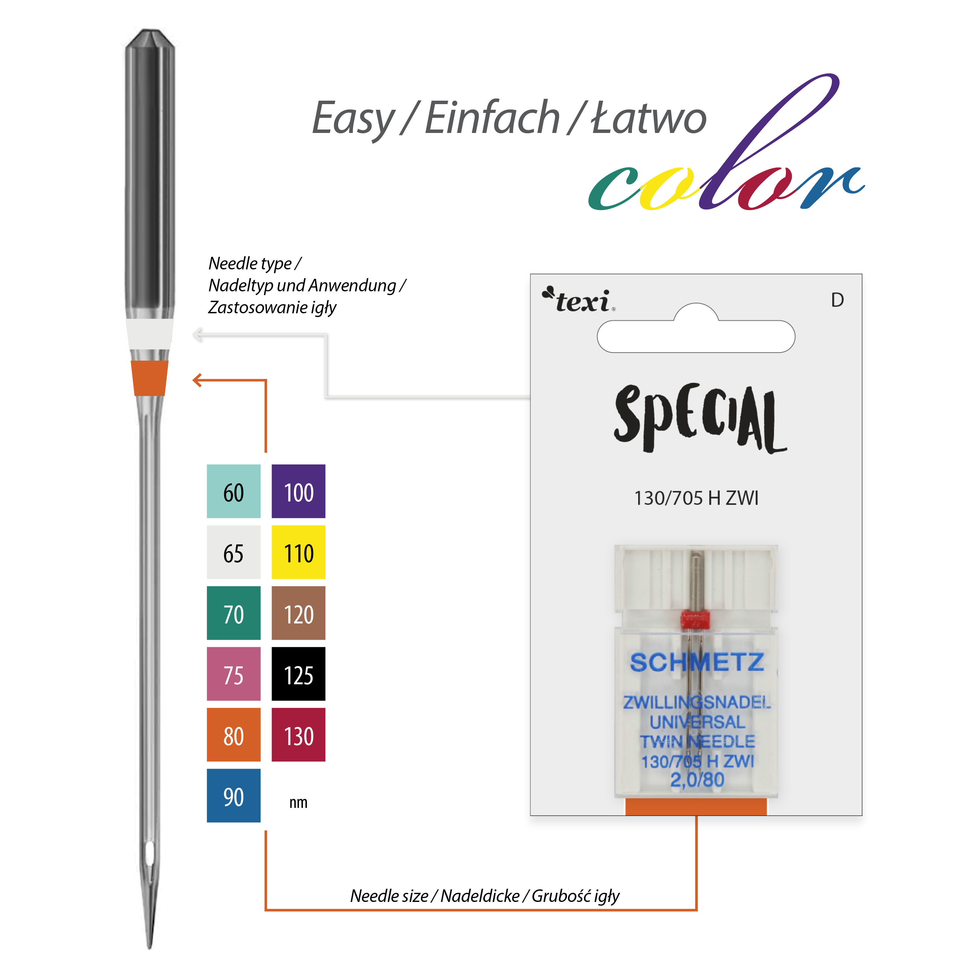 Twin TEXI needle for decorative stitch, applications - for fabrics.